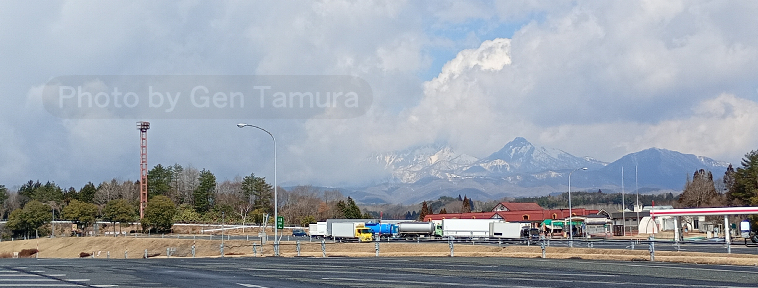 蒜山高原SAで休憩。昨年と同様、この辺りから山道の端に雪が残っていました。大山の眺めが雄大でした。
