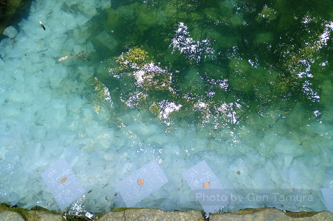 澄んだ水面を見下ろしますと、池底には数百枚はありそうな占い用紙が積もっていて殆ど真っ白でした。参拝者数が急増したことが一目瞭然で、改めて朝ドラ効果の大きさを実感しました。